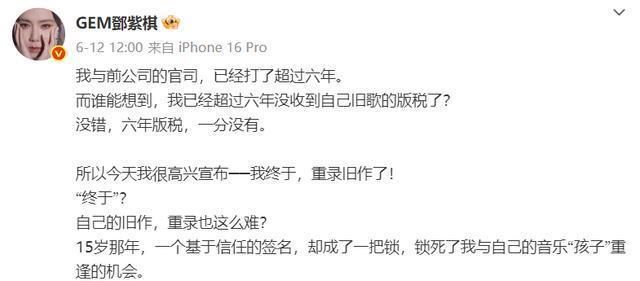 音乐的纠纷险些都是由版权引起的。 邓紫棋最近就上线了我方往日 12 首歌的重录版,因为在签约时她把我方的作品的著述权透顶交给了公司代理。 但她 6 年都莫得收到版税了。